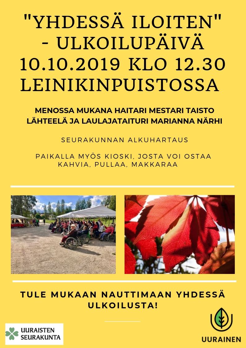 Tervetuloa kaikki ulkoilemaan Leinikinpuistoon torstaina 10.10.2019 klo 12.30! Yhdessä Iloiten- ulkoilupäivän järjestävät Uuraisten seurakunta ja Uuraisten kunta.