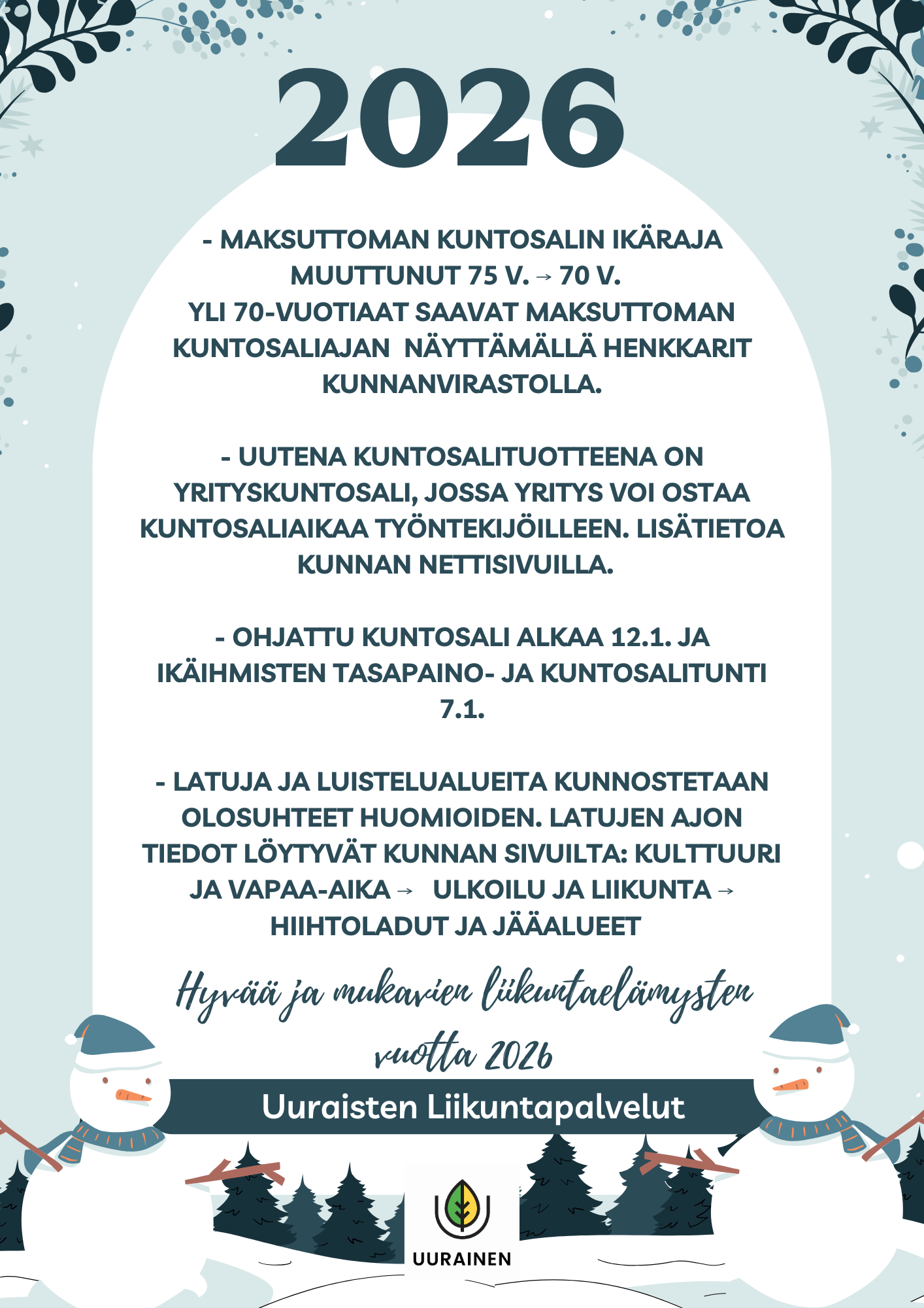 - Ikäihmisille kuntosali- & tasapainotunti keskiviikkoisin klo 9.30-10.30. Tasapainotuntia ei pidetä 24.12. & 31.12. Kuntosali- ja tasapainotunnit jatkuvat 7.1.2026 . Mainos löytyy täältä.