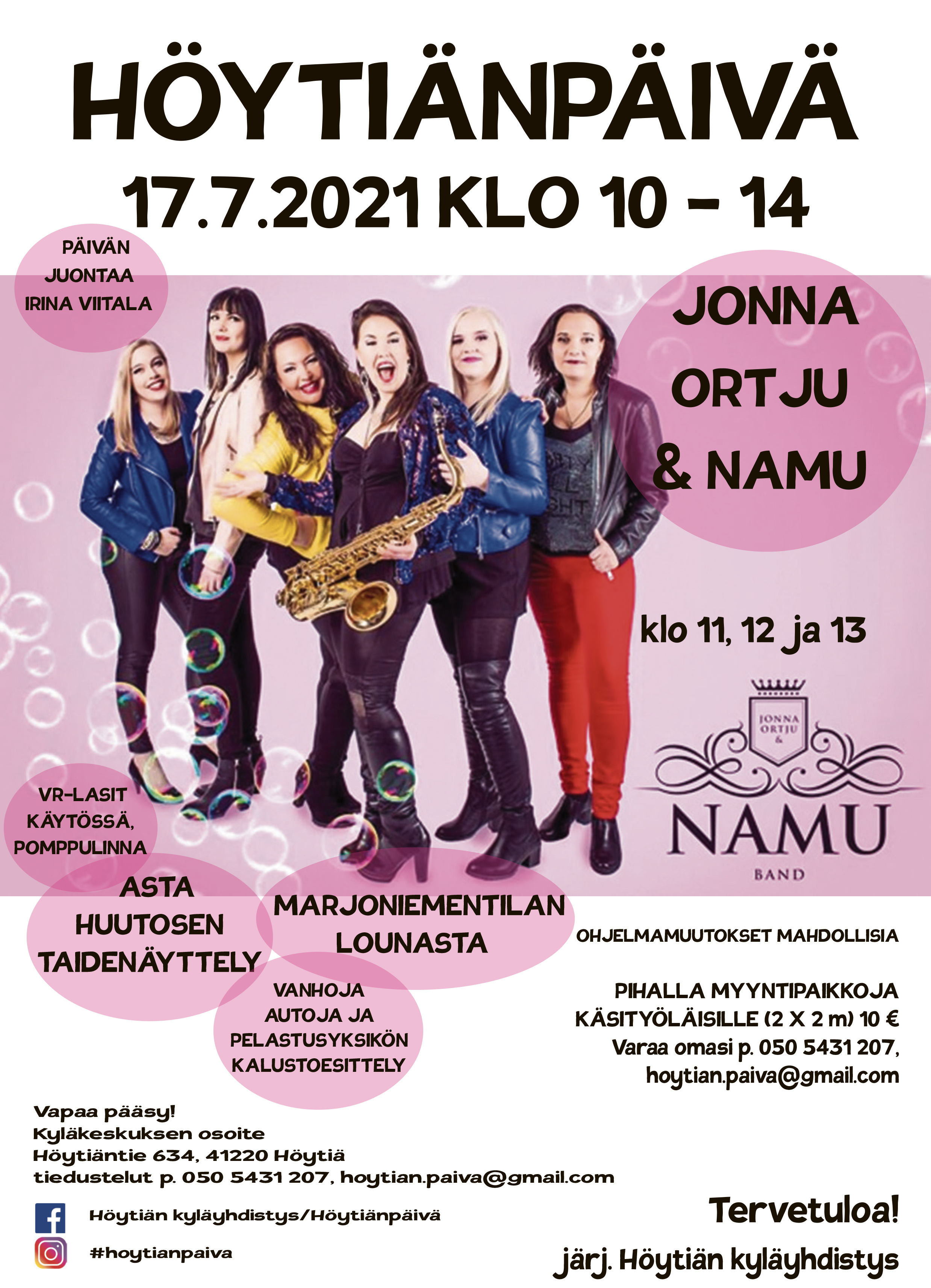 Höytiän päivässä 17.7.2021 ajalla 10-14 mm. Jonna Ortju ja Namu, VR-simulaattori, taidenäyttely, Marjoniementilan lounasta ja kotiseutumuseo avoinna! Ohjelma tarkentuu lähempänä ajankohtaa mm. somekanavilla. Pihalla myyntipaikkoja käsityöläisille, varaus nrosta 050 543 1207.
